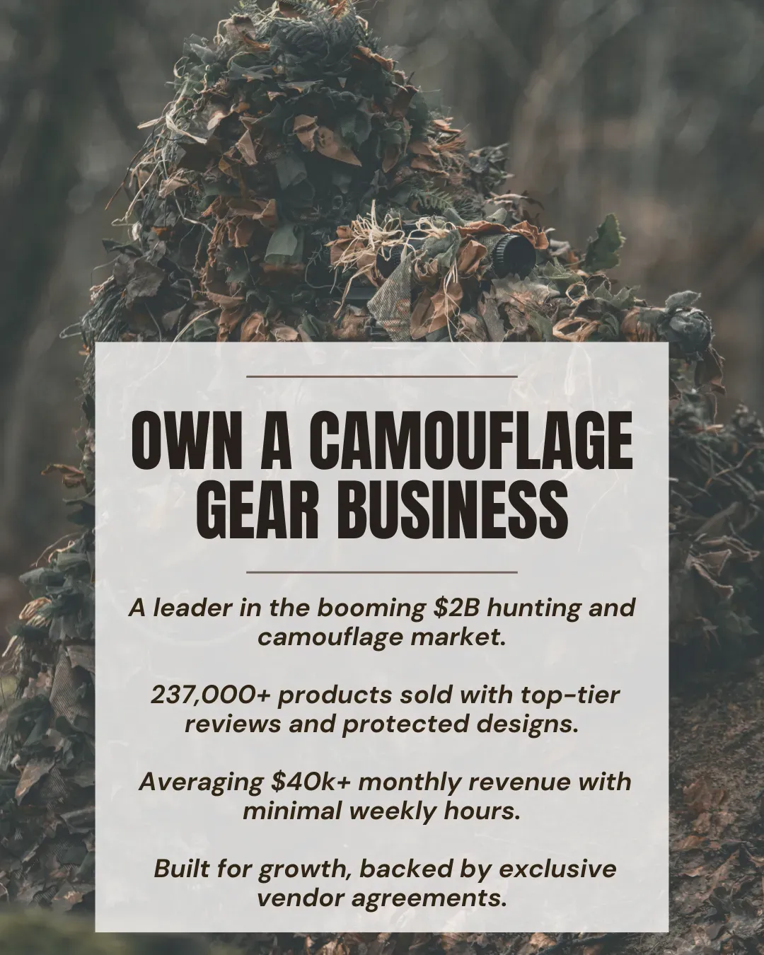 This 18 year old hunting + camo brand comes with 237k+ sales, exclusive designs (trademarks, patents, and copyrights), and incredible reviews. ⭐
